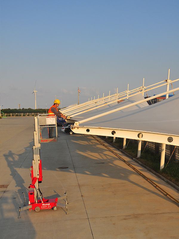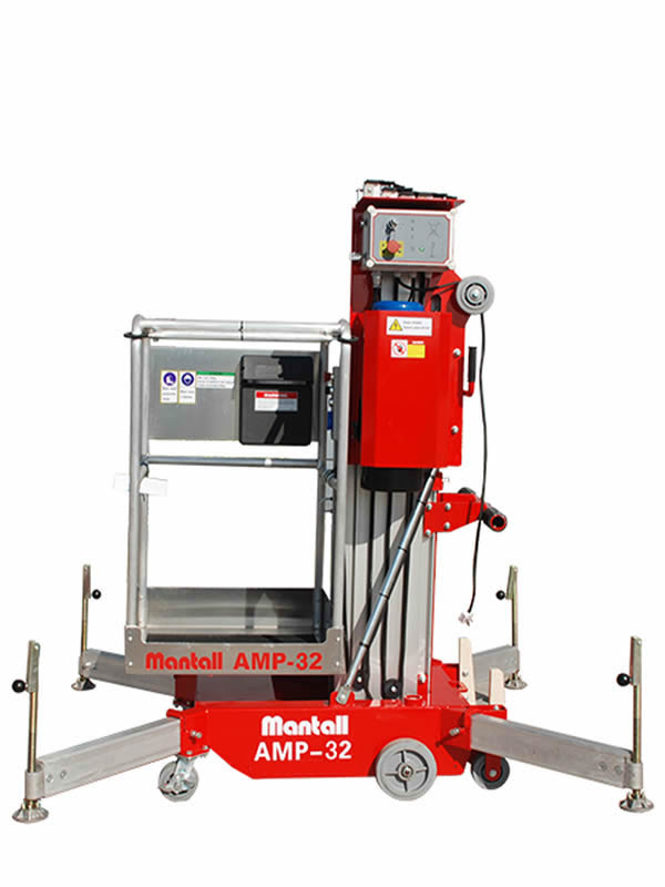 Mantall AMP series single mast aerial work platform is intended to lift worker with necessary tools to working heights of up to 14 meters. The unique design of lifting mast provides excellent stability, enabling operations more safe and easier. The single mast aerial work platform is built to be as compact as possible, so that the operator can move it through standard doorways or very narrow passages even when the working height is up to 12 meters, without the need for tilting the platform. The single mast aerial work platform is provided with dual control system that enables the platform to be moved up and down by simply controlling from either the platform or ground control station.
