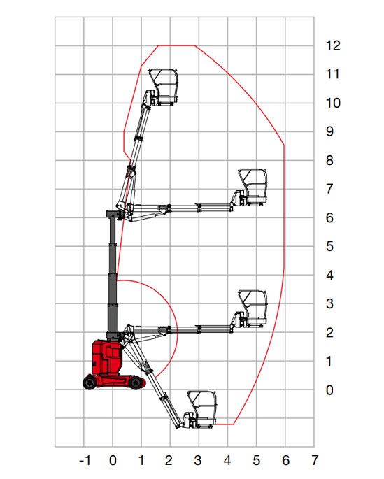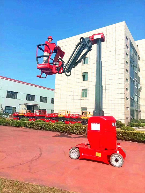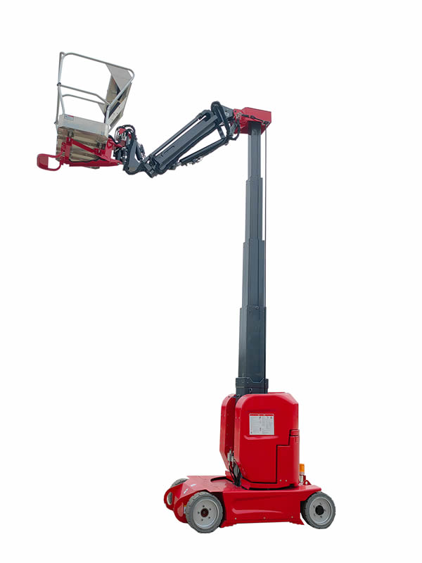 Mantall IMP120J vertical mast lift is an aerial work platform that uses multi-stage mast to accommodate multi-level job site and can pass through doorways, narrow aisles or other tight spaces. It can elevate worker and tools to working heights of up to 12 meters, with a maximum load of 200kg and a maximum working radius of 6 meters. A 345° non-continuous turntable coupled with 135° (-60°/+75°) vertical rotating jib and 90° rotating platform allows for exceptional working range and precise positioning.