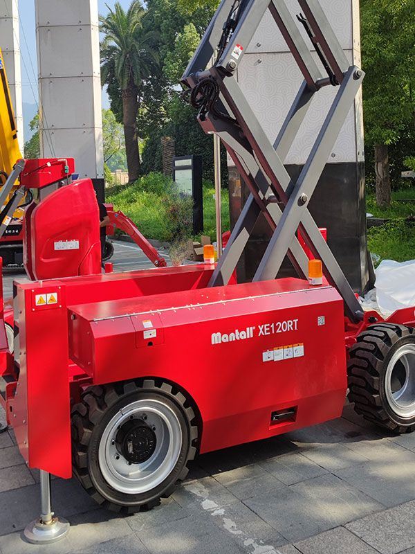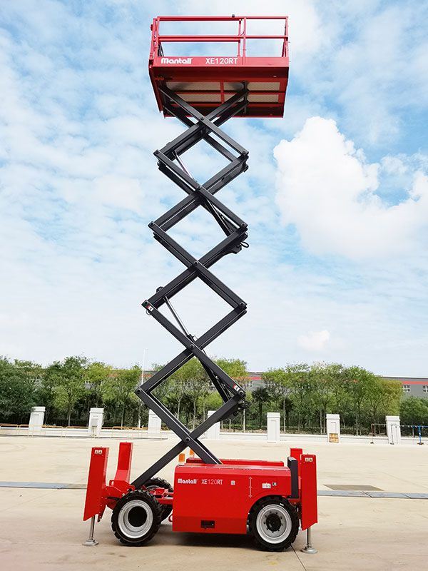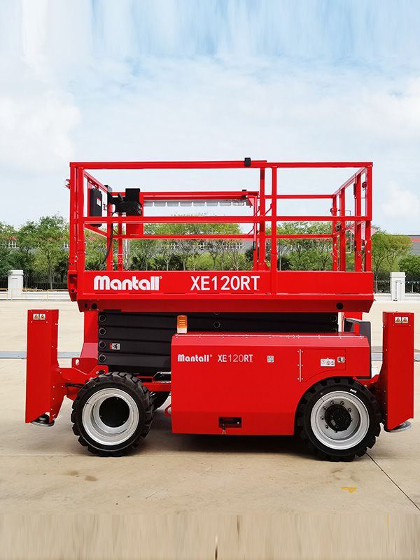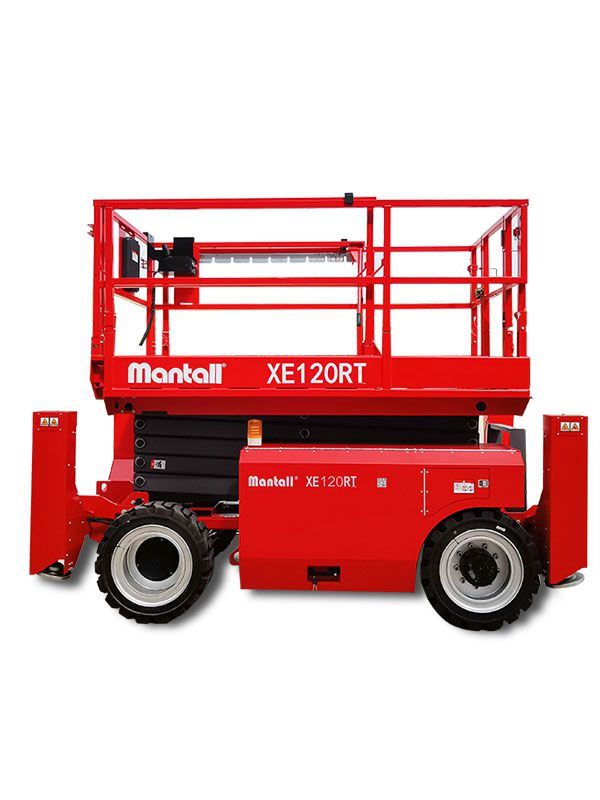 Mantall XE-RT series self-propelled rough terrain scissor lifts are a type of aerial work platform that uses battery power and operates without emission and noise. Equipped with powerful 4-wheel drive, this self-propelled scissor lift is ideal for rough terrain and performs well in terms of the driving force and gradeability. It can drive smoothly at the maximum traction speed of 4km/h. XE-RT series self-propelled rough terrain scissor lift is capable of driving at full height, greatly improving working efficiency. Besides, the scissor lift is also equipped with the on-board diagnostic system and trouble alarm.