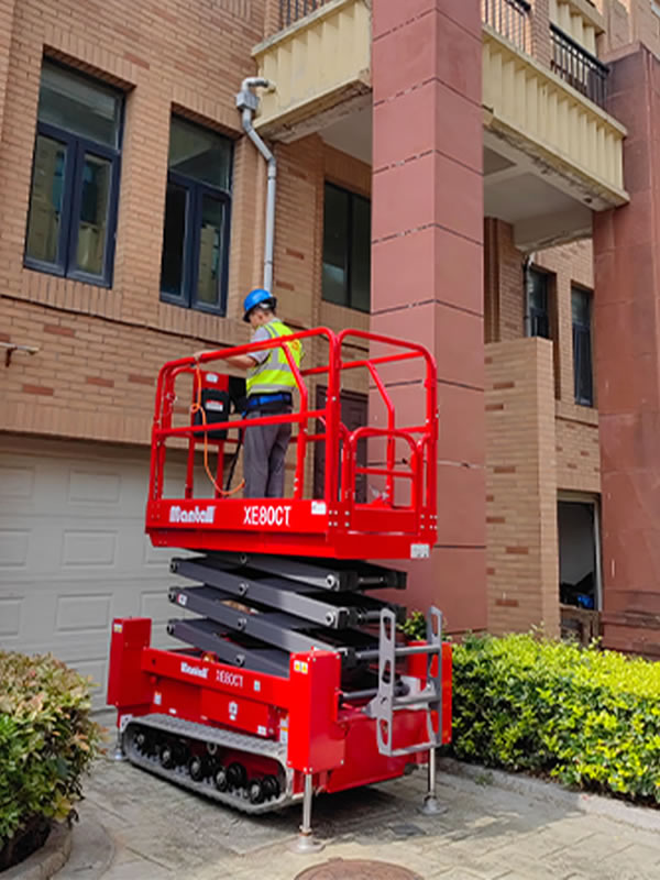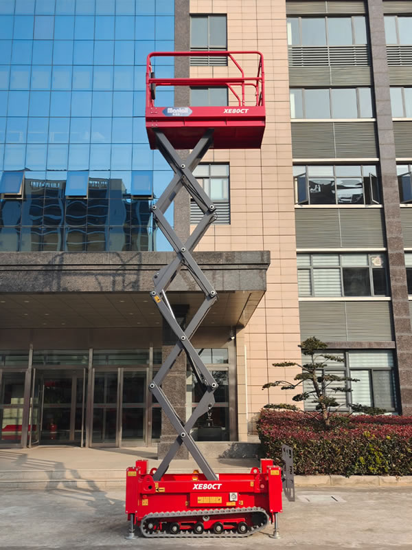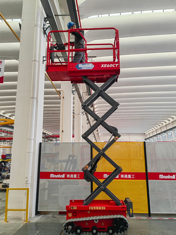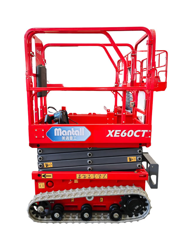 Mantall XE-CT series crawler scissor lift features a rubber-track undercarriage with a tank-like structure, which allows it to work on soft terrain without sinking, thus overcoming the restriction that aerial work platforms only can operate on the hard ground. This crawler scissor lift will not damage the floor or leave a trace when turning at zero degree thanks to its non-marking rubber tracks, making it suited to indoor jobsites. The crawler track system is characterized by low noise level and less vibrations, and ideal for quick transportation from one job site to another.